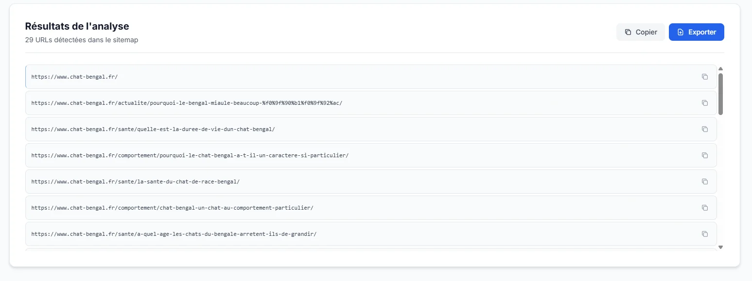 En quelques secondes, toutes les URLs contenues dans le sitemap s’affichent. L’outil permet :